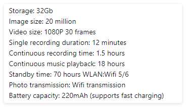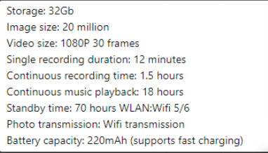 Go to the shopSmart AI camera glasses with HD video, anti-shake recording, voice call, translation, and object recognition. Touch controls, ABS material, 390mAh battery. Sunglasses and transparent lens options. Includes case, cable, and cloth.