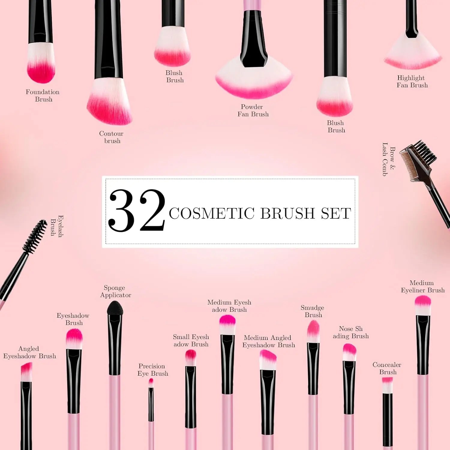 Professional 32-piece Makeup Brush Set: Includes 6 large Kabuki brushes and 26 precision brushes, suitable for eyeshadow, blending eyeshadow, concealer, blush, foundation, loose powder/pressed powder, highlighter, and eyebrows. Ideal for applying, blending, and creating a refined makeup look.